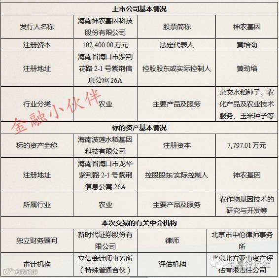本次交易为海南神农基因科技股份有限公司(以下简称“神农基因”)以发行股份的方式为支付对价,收购广东塔牌集团股份有限公司(以下简称“塔牌集团”)所持有的海南波莲水稻基因科技有限公司(以下简称“波莲基因”或“标的公司”)35.15%股权,收购黄培劲所持有的波莲基因17.58%股权,收购孙敏华所持有的波莲基因8.79%股权。本次交易波莲基因61.52%股权的交易价格为70,000万元,按发行价格4.23元/股计算,上市公司发行股份数量不超过165,484,634股。
