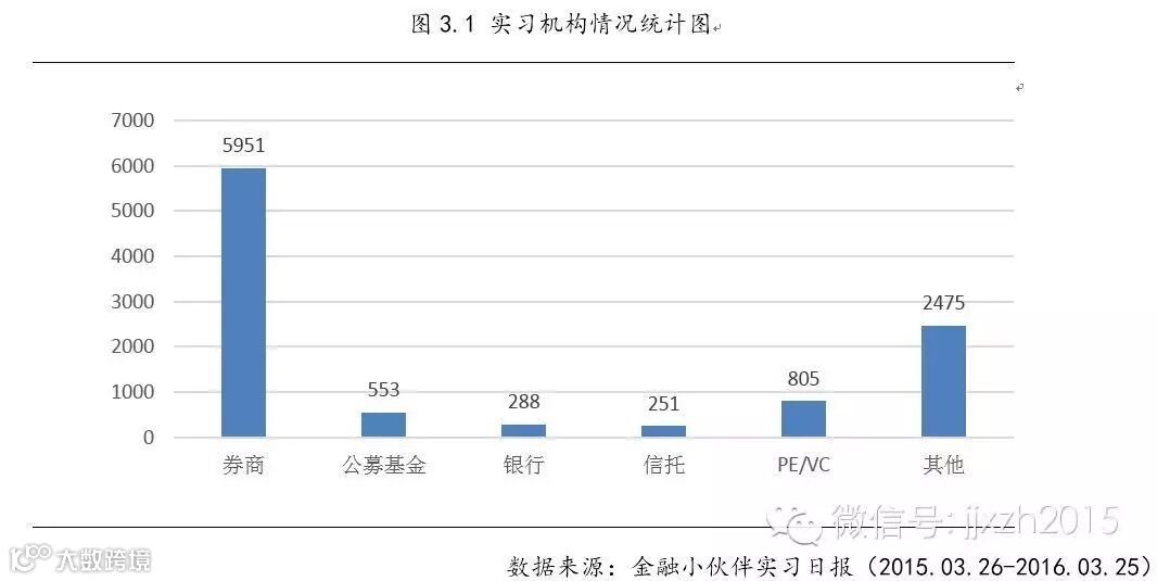 统计结果显示,实习日报推送的各机构实习信息中以券商实习为主,总计高达5951条,同比增加31%。具体来说,近年新三板挂牌业务剧增、债市火爆、并购市场日趋升温等因素都推动了券商业务的扩张,进而为同学们提供了更多的实习机会。推送的PE/VC机构实习信息总计有805条,相比往年增长27%,这也与去年底之前国内私募机构法律监管环境相对宽松,私募基金井喷式发展的市场局面相符。除此之外,推送的公募基金实习信息为553条,较往年相比增长13%,其中尤以基金子公司资管业务的实习岗位贡献颇多,占比超过67%。