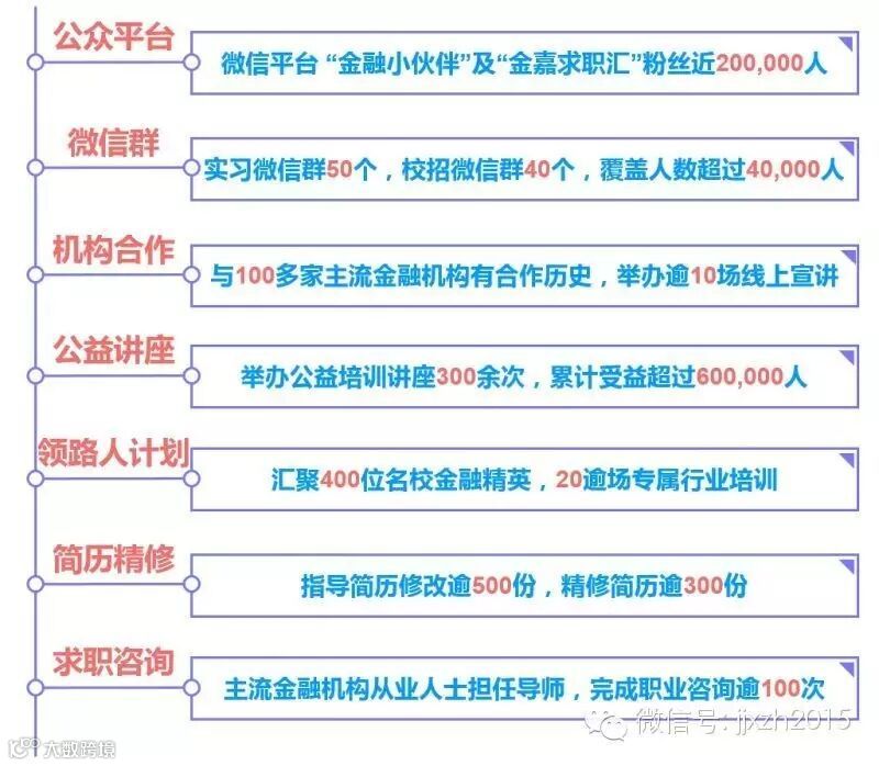 金融小伙伴旗下品牌 “金嘉求职汇”,创建于2015年9月,专注于金融求职与招聘;目前平台独立粉丝数超15000,与“金融小伙伴”主平台合并粉丝数近200,000。