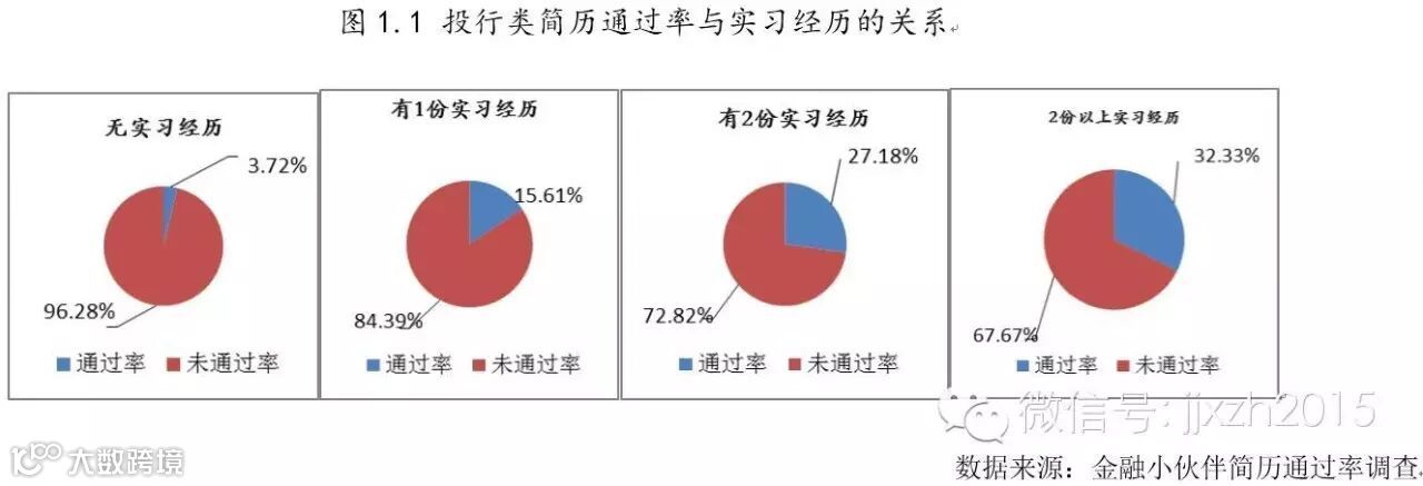以投行为例,没有投行相关实习经历的简历通过率只有3.72%,如有匹配实习简历后的通过率就会大幅度的提高,两份实习经历后的简历通过率达到27.18%。这充分说明了对于投行类岗位,实习可以有效地提高简历通过率。