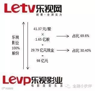 乐视网5月6日晚间发布公告称,拟向乐视影业股东以41.37元/股发行1.65亿股,并支付现金29.79亿元,合计作价98亿元,收购乐视影业100%股权。整个交易的对价支付将以股份和现金相结合的方式进行,合计的股份和现金支付的比例分别为69.60%和30.40%。