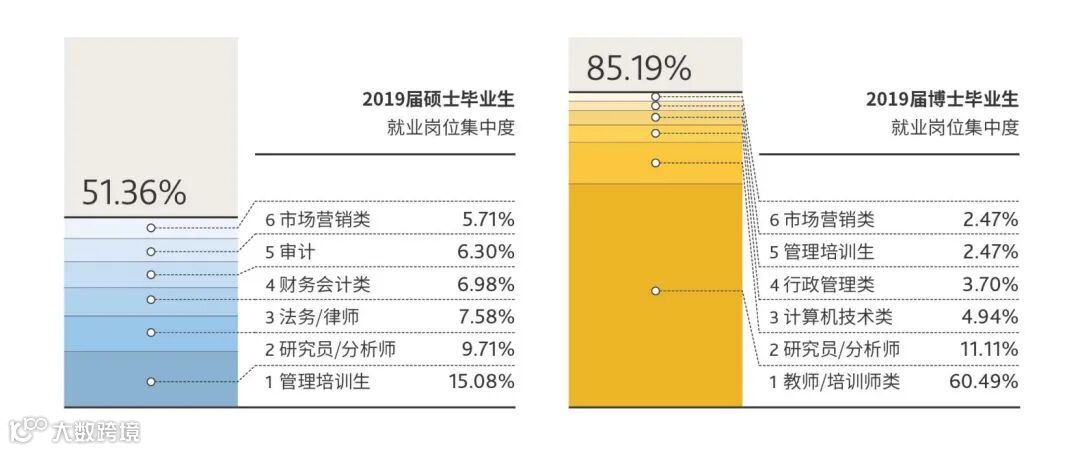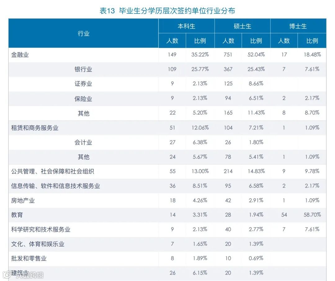 2020年,本科、硕士毕业生签约金融业单位比例分别为35.22%、52.04%,博士毕业生签约教育行业单位比例为58.7%。