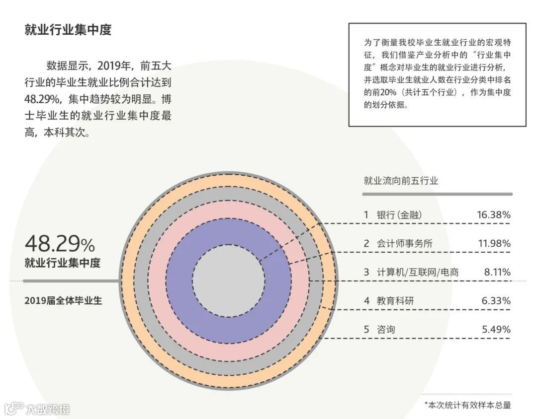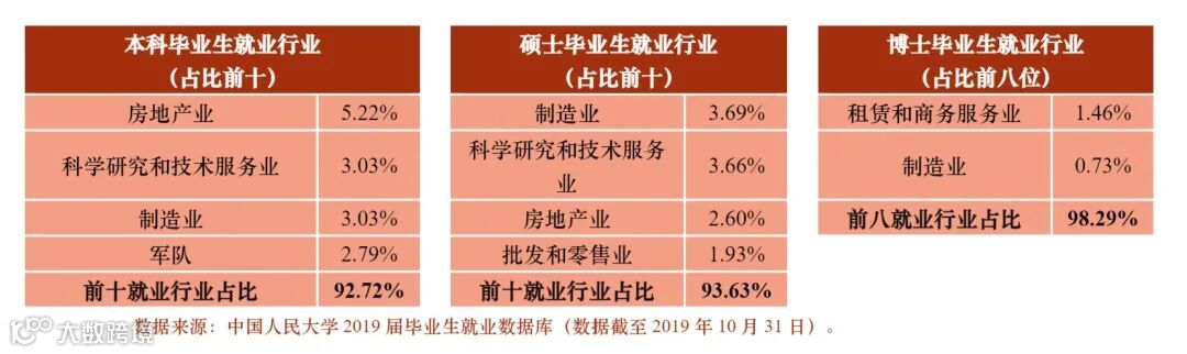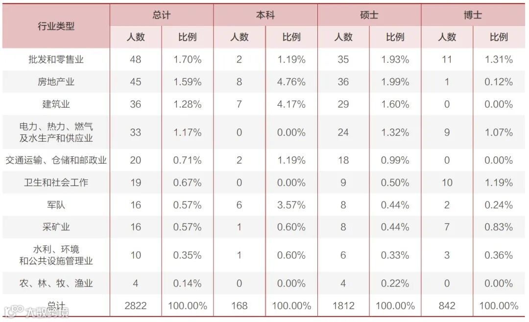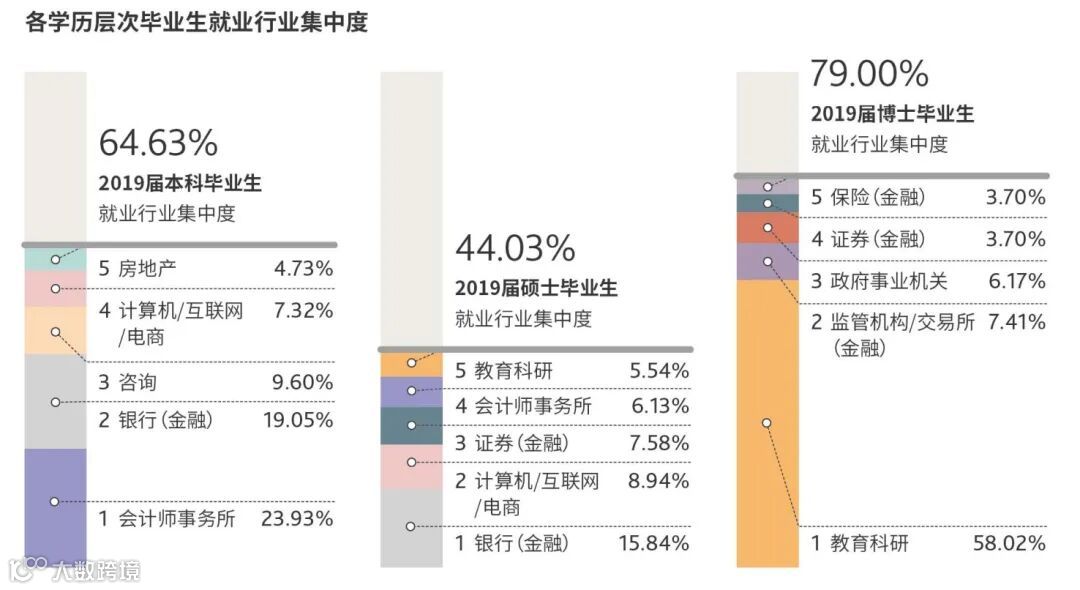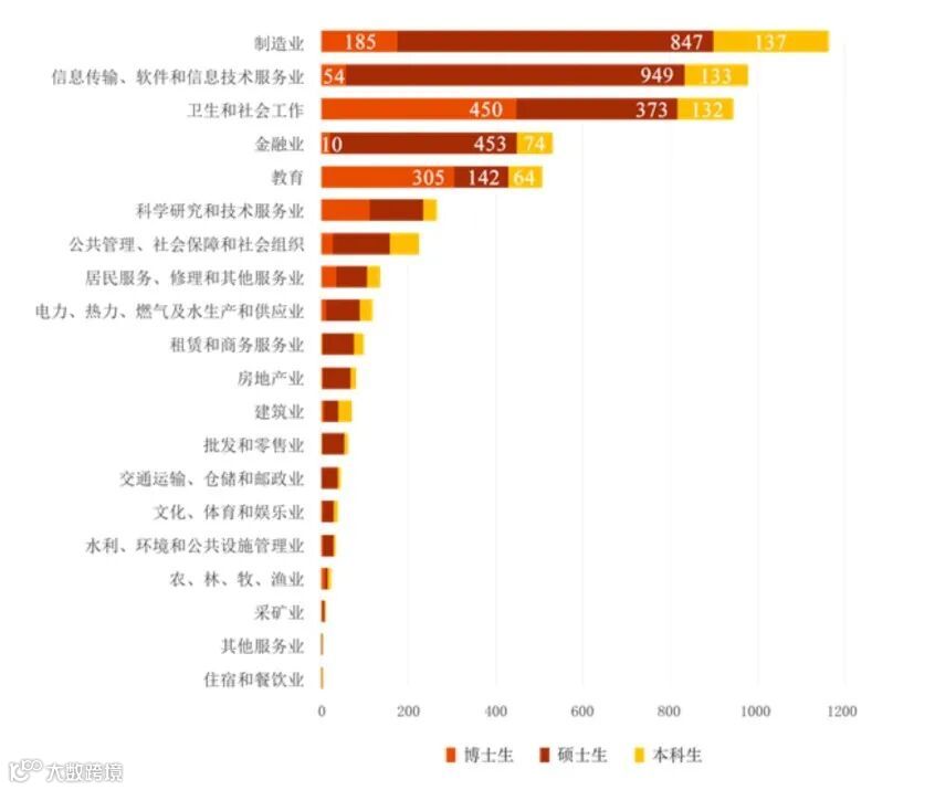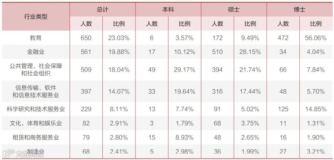 金融业为本科、硕士毕业生最主要的行业流向,教育业为博士毕业生最主要的行业流向。