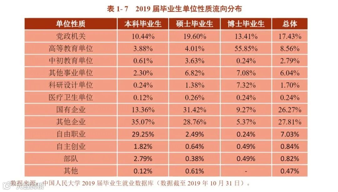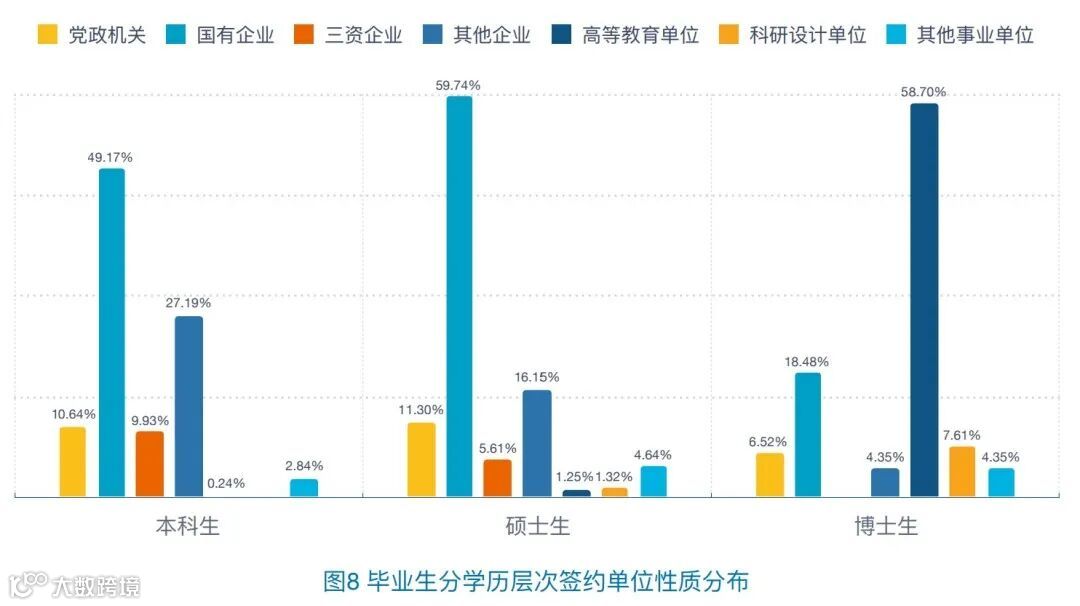 进入党政机关(17.43%)、事业单位(含中初教育单位、高等教育单位、科研设计单位、医疗卫生单位和其他事业单位)(19.33%)和国有企业(26.27%)就业的比例合计为 63.03%。