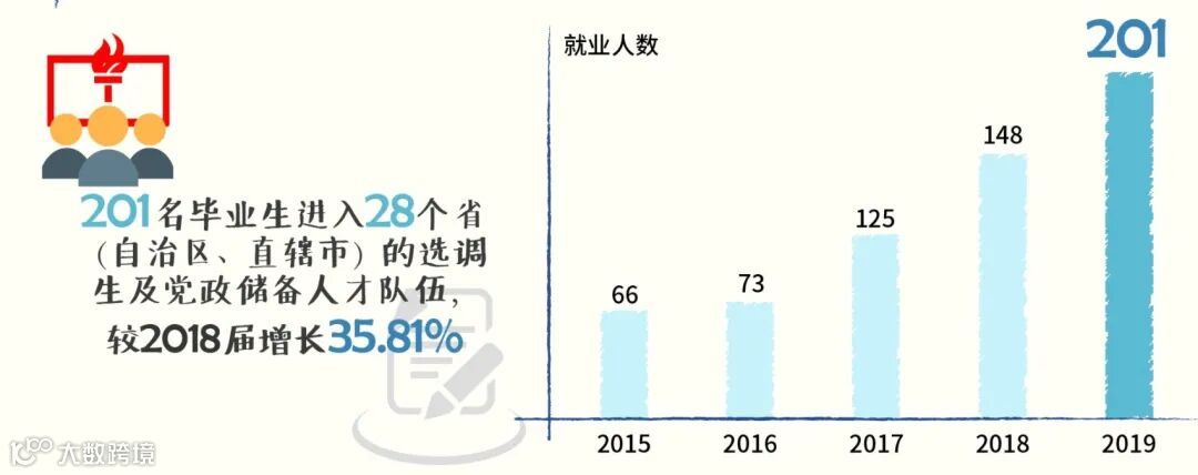 2020年有204名同学被录用为选调生,赴全国25个省(自治区、直辖市)基层公共部门就业。