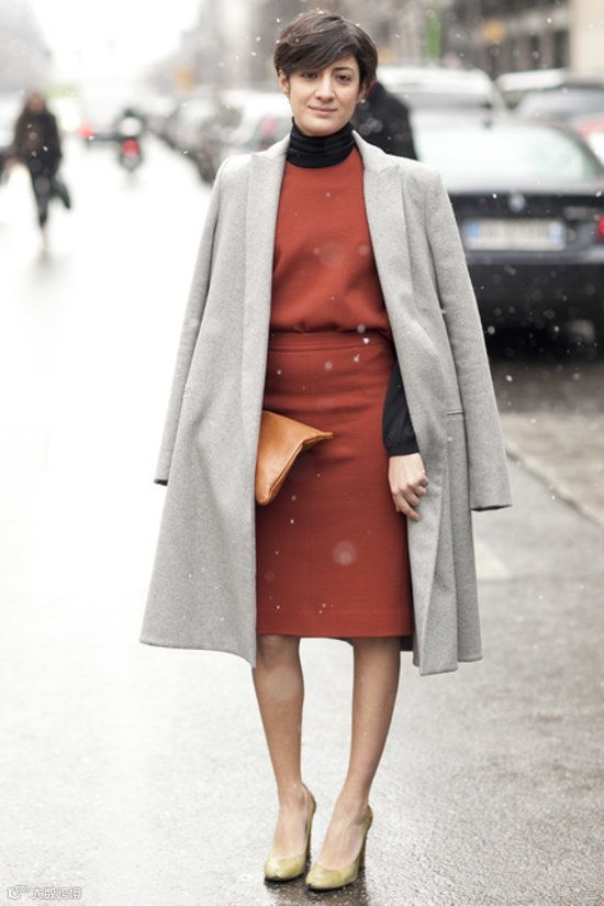 连衣裙虽然方便好穿,但对于身材的比例要求比较高。比如有同学是身短脚长的身体比例可能会碰见连衣裙不太合身的窘境,经常是腰间出现多余的布料。但是穿两件式的话就不会出现这样的问题啦。但记得一定要选及膝的长款铅笔裙,太短的话就很容易显得俗气,看起来也不够专业。