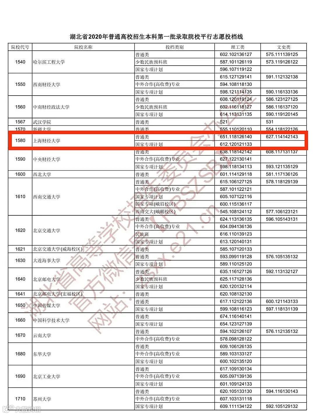 根据《2020年湖北省普通高校招生本科一批院校平行投档分数线》,上海财经大学国家专项计划的投档线为612分。