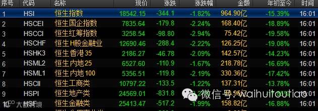 香港股市:香港恒生指数收盘跌1.8%,至18542.15点,创2012年6月来新低,同时也是自1998年以来首次跌至净资产以下。当前上证指数的PB为1.7,恒生国企指数的PB为0.8,标普500指数的PB为2.51:
