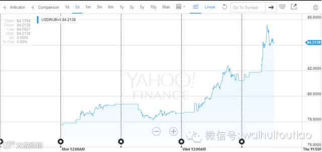 今日卢布兑美元再次急跌,跌破85关口,刷新历史最低。