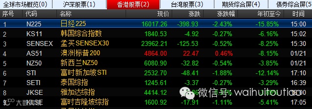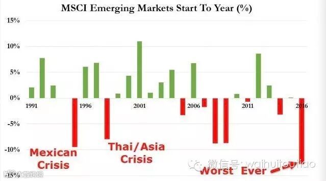 MSCI新兴市场指数再度暴跌3%至692.76,创2009年5月以来新低。今年以来,该指数累计跌幅已达13%。同期,新兴市场股票市值蒸发逾2万亿美元。据彭博,13%的开年跌幅已经超越了1998年亚洲金融危机时期和2009年全球次贷危机时期的惨烈程度。