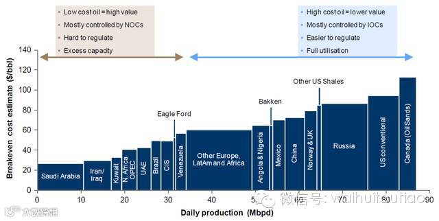 Gail Tverberg用一张图说明了哪些国家是低成本产油国,而多数产油国的成本超出30美元。