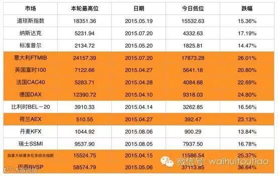周三当日,日本股市和英国股市亦进入技术性熊市。日经225指数周三收盘大跌3.7%,报16416.19点,较去年6月高点下跌逾20%。英国富时100指数收跌3.61%,报5664.61点,较2014年4月纪录高位7122.74点下跌20%。