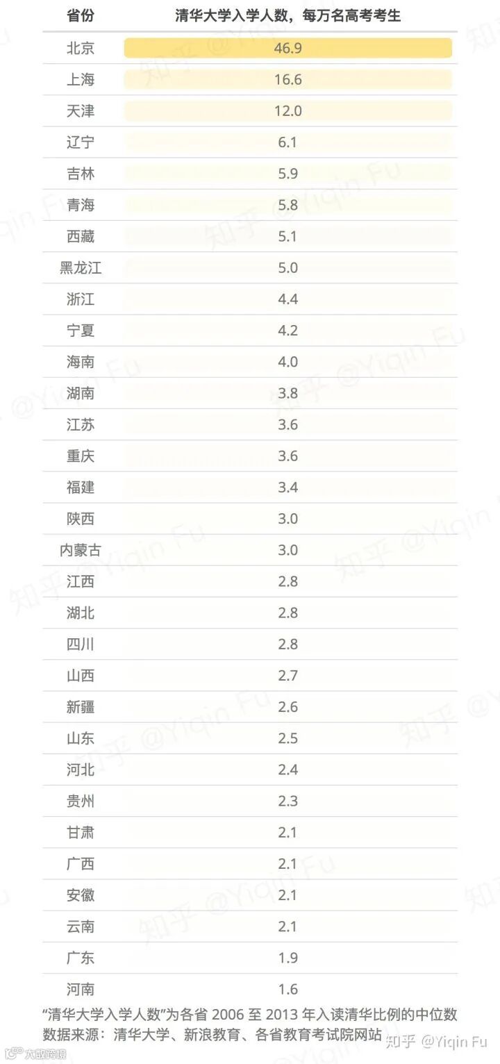 各省份因为教育资源、竞争人数之间的巨大差异,造成名校招收各省的新生人数差异较大。就拿清华大学为例:有媒体计算过,北京每万名高考报名学生中,有47人可以入读清华,而河南则是北京的三十分之一,每万名考生中仅1.6人入读清华。如果说清华在北京是百里挑一,那在河南则是六千里挑一,河南考生考去清华的难度不亚于登天。