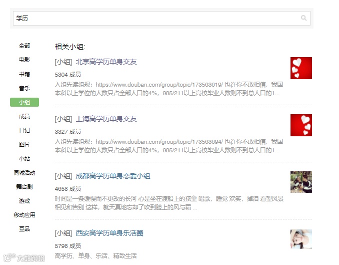 近期,“985相亲局”在网上引起热议。“学历”成为年轻人通往婚姻一个重要的通关秘钥,每个人都被明码标价,用光鲜的履历寻找与自己“势均力敌”的优质对象。甚至在豆瓣上搜索“学历”二字,首先映入眼帘的就是各种各大城市的“高学历单身交友小组”。