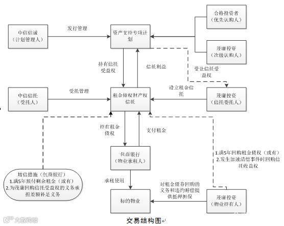 3.针对信托计划提供外部增信。资产支持专项计划内部多通过分层进行增信,外部通过向信托公司提供抵质押等担保措施增信。从上文的交易结构图中可以看到,针对租金债权财产权信托,包商银行和茂庸投资均有提供相应的外部增信措施,如差额补足、债权受益权回购、资产抵押等措施,这和传统的信托项目类似,显示了信托公司在该项目中承担了实质风险。