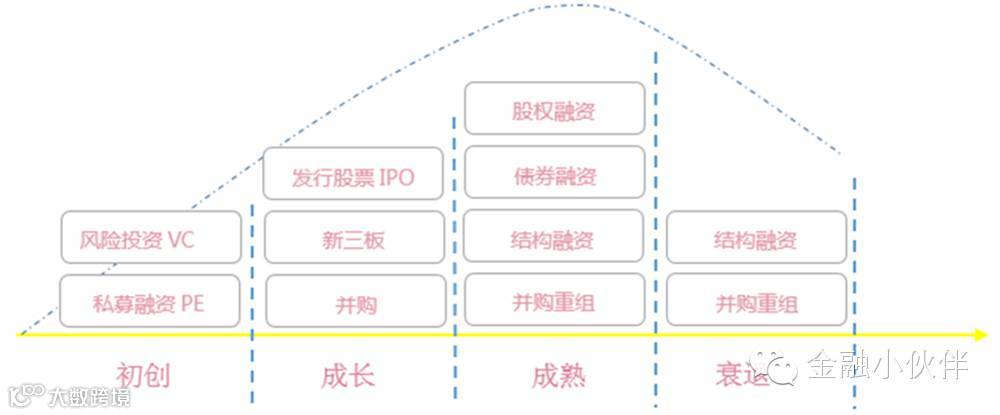 企业的四个成长周期中生命周期中,除了初创时期的融资投行没有参与,后面三个周期均会涉及到投行业务。为了帮助大家理解,请看下面这幅图