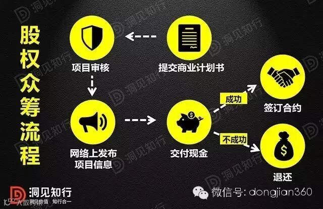 以大家投网站为例:假设某个创业企业需要融资100万元,出让20%股份,在网站上发布相关信息后,A做领投人,出资5万元,B、C、D、E、F做跟投人,分别出资20、10、3、50、12万元。凑满融资额度后,所有出资人就按照各自出资比例占有创业公司20%股份,然后再转入线下办理有限合伙企业成立、投资协议签订、工商变更等手续,该项目融资计划就算胜利完成。