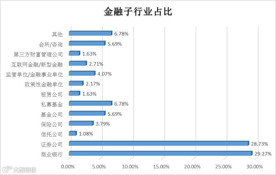 银行业因为偏好校招的原因,每年都是解决应届金融就业的大户,统计依然高居第一,不出意外。证券、信托、基金均是靠风险管理吃饭,存在行业系统风险因素,但一旺俱旺,赚钱相对较易,短期回报较高(风险亦大),相对银行等金融机构其个人投资管理、金融运营能力要求更高,对学历要求也相对较高,每年都有相对较大的用人需求,也吸引了众多金融业求职者。会所/咨询对于应届毕业生是很好的就业起跳平台,相对高强度工作对应的也是宝贵的工作经验,每年也会招募吸引大批求职者。总体来说,我们所设置的所有选项,基本都有学生选,证明应届学生的在金融业就业也逐渐趋向多元化。