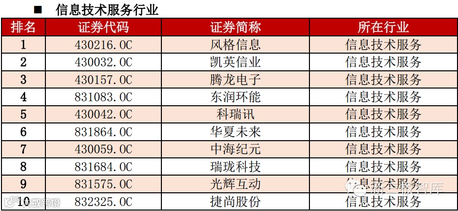 信息技术服务行业本是创新频繁的行业,因此该行业内企业的创新“竞争”也是相当激烈。在我们的评分体系中,风格信息和凯英信业还是并列行业第一名。