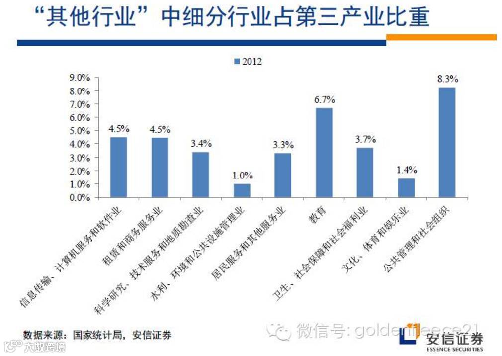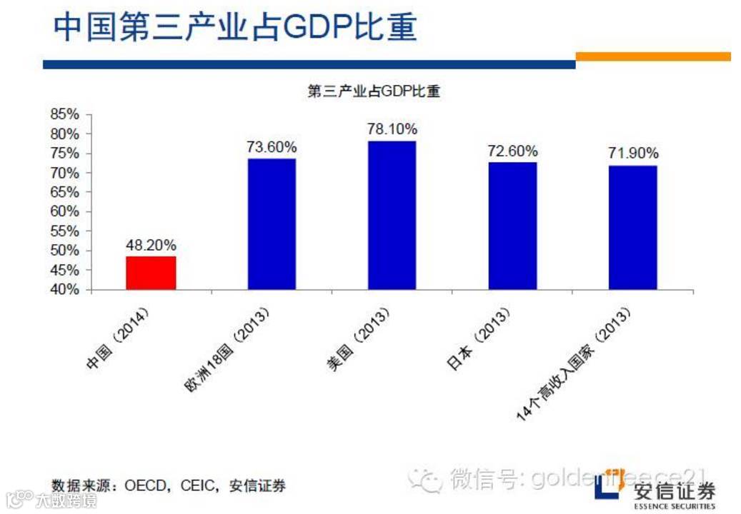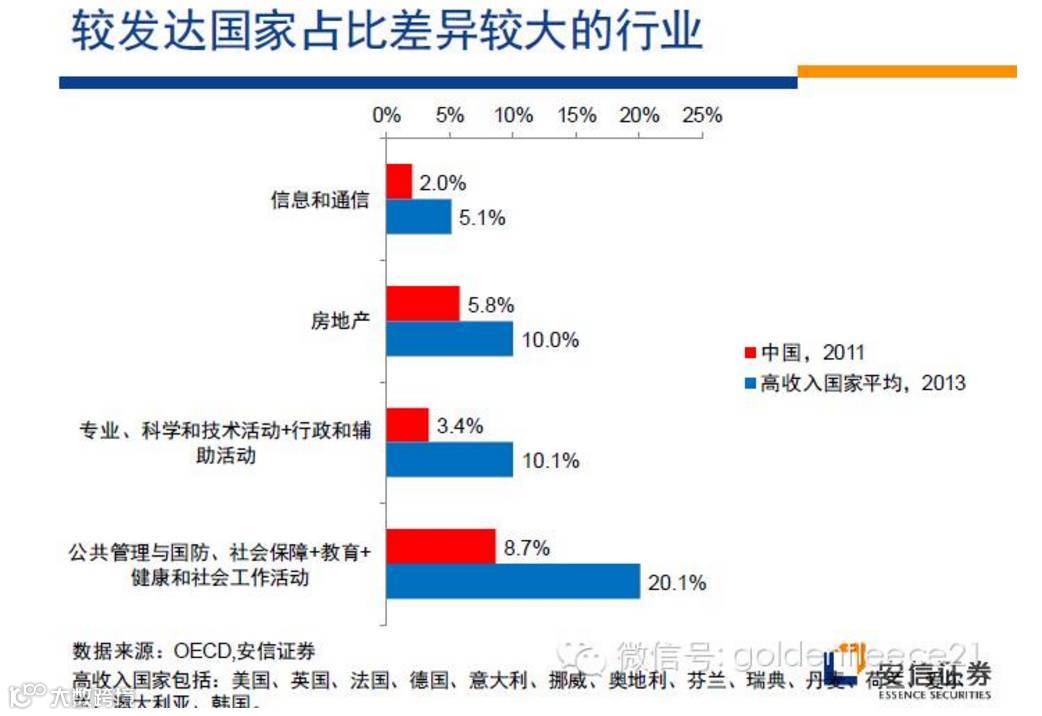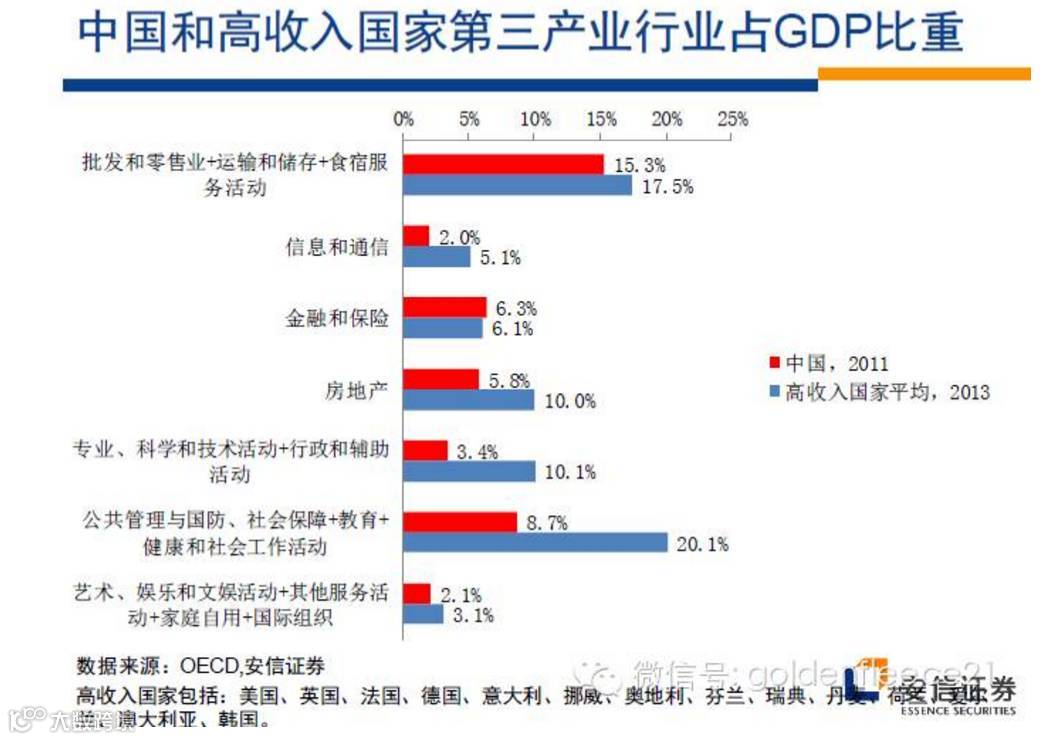 中国第三产业占GDP的比重,与发达国家相比差距较大,特别是在信息和通信、房地产、社会中介服务、教育医疗公共管理等领域仍有较大的发展空间。