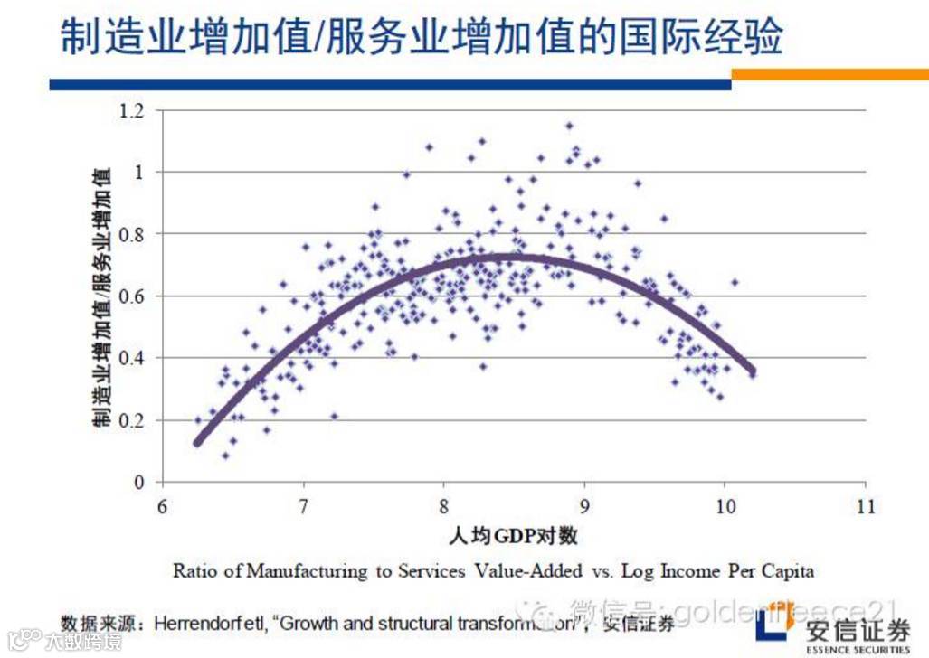 随着人口红利的消失和重化工业化高峰的结束,中国经济潜在增速在过去5年趋势下移,到2020年潜在增速可能继续下降到5-5.5%的水平。从国际经验来看,在人均GDP达到8000-10000美元(1990年不变价美元)的区间,制造业与服务业增加值之比见顶回落。中国人均GDP已跨越这一区间,意味着未来制造业增速将低于GDP增速,服务业增速会高于GDP增速。
