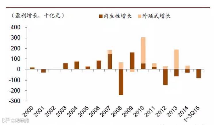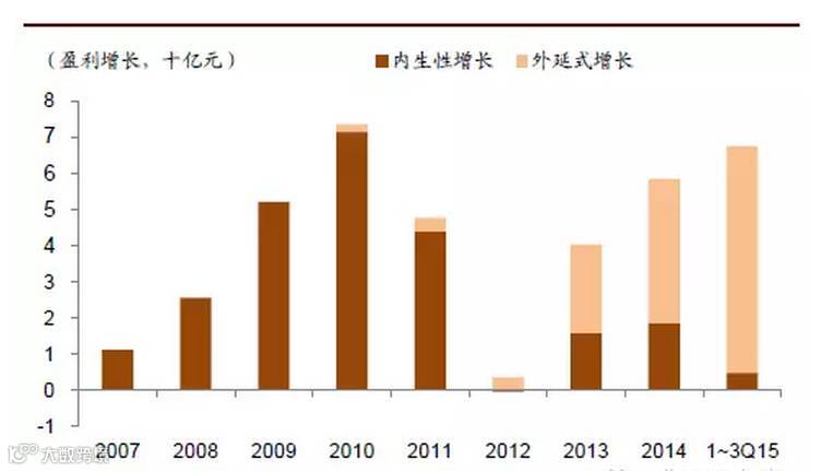 尤其严重的是,通过收购来“购买增长”已经成为中小创公司的主要增长方式,中小板和创业板90%利润贡献来自外延式增长。以上市公司每年度兼并收购交易额与上市公司年末ROE 的乘积衡量兼并收购带来的业绩增长(即为外延式增长),数据显示:非金融上市公司近年来盈利增长主要来自于收购兼并带来的外延式增长,企业原本业务的内生性增长贡献持续下滑: