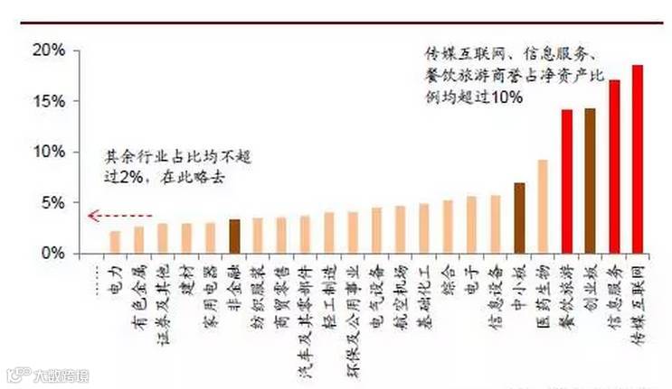 中小市值公司尤其是其中的TMT 板块商誉潜在风险较大。分行业来看,传媒互联网、信息服务行业商誉占净资产比例已经接近20%,是比例最高的行业: