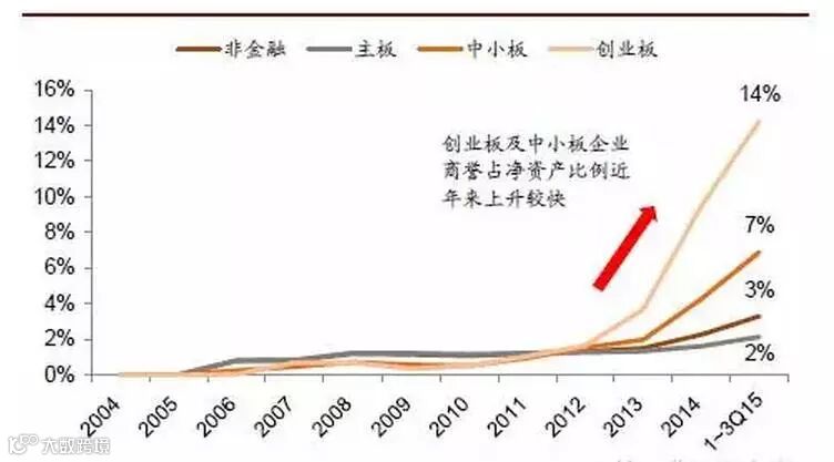 正常来讲,理性的公司不会以远超公允价值的价格购买资产,即使有也是个案,不会是普遍现象。然而由于估值畸高,A股成为了高价收购的温床。据彭博统计,仅2015 年A 股市场并购重组交易便涉及金额1.4 万亿,创下历史新高,比2014 年的0.83 万亿大幅上升了77%。并购市场的活跃以及资本市场的繁荣使得被收购公司同样估值高企,不少被并购资产的估值明显超过其账面价值,导致A 股市场上商誉占净资产的比例加速上升。截止2015 年三季度,非金融企业中商誉占净资产的比例已经达到3%(前几年该值一直在1%附近)。中小板及创业板非金融企业商誉占净资产比例分别达到7%及14%,远远超过主板非金融企业(2%左右):