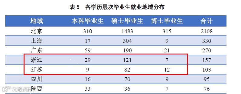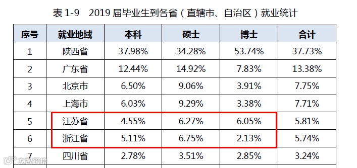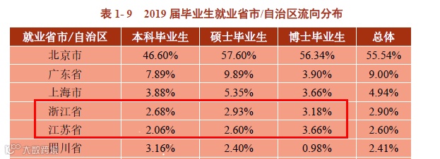但仔细看,浙江对本硕毕业生吸引力较大,而江苏对博士毕业生吸引力较大: