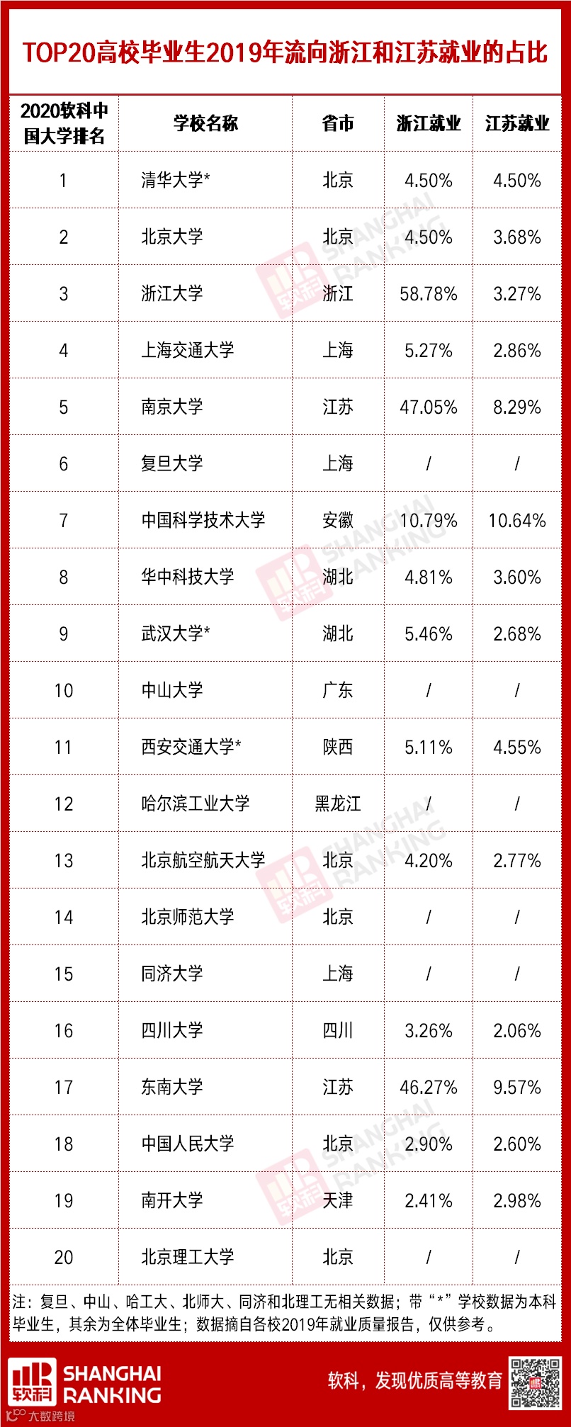 放眼全国,我们再从2020软科中国大学排名TOP20高校毕业生的就业去向来看(除去浙江省的浙江大学和江苏省的南京大学、东南大学),浙江的总占比要大于江苏。