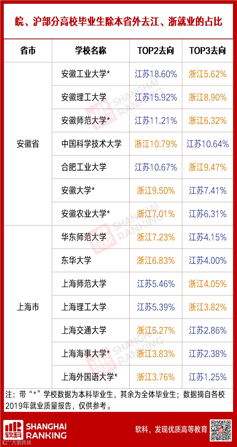 长三角地区,我们从上海和安徽部分高校中,摘录了毕业生们就业选择江、浙的占比,发现安徽毕业生对江苏的偏爱要大于浙江,而上海毕业生则更加青睐浙江。