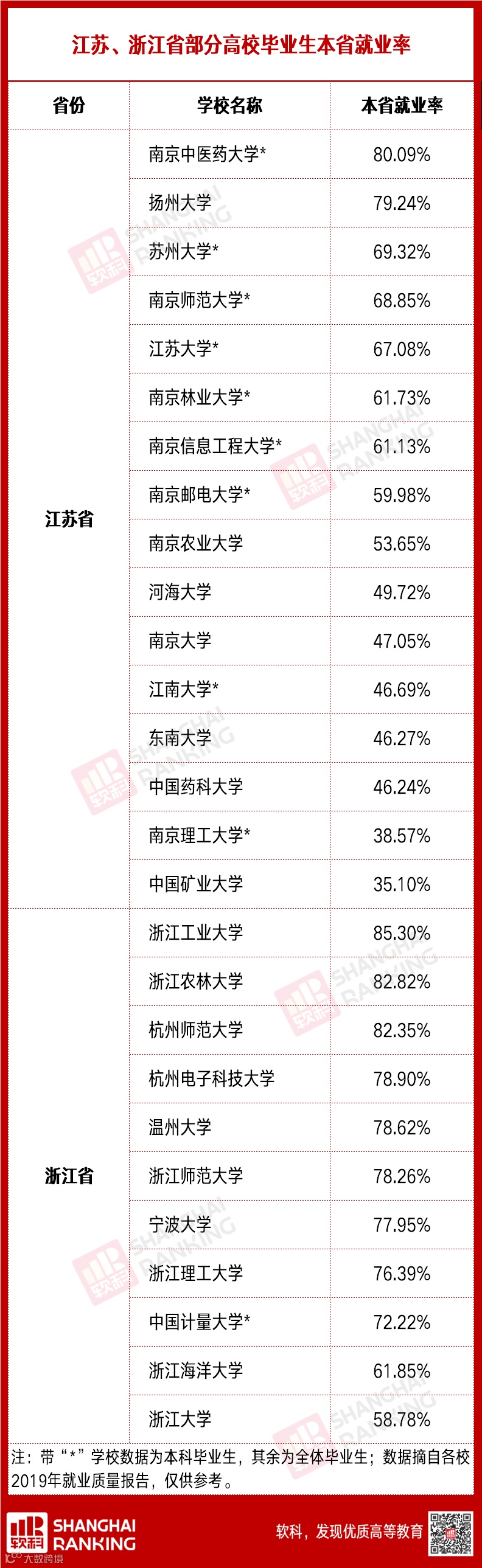 2019年各校就业质量报告中,江苏和浙江各有十多所高校的数据,平均下来浙江约有75.77%的本省就业率,江苏平均为56.92%,浙江省对本省毕业生的吸引力要大于江苏。