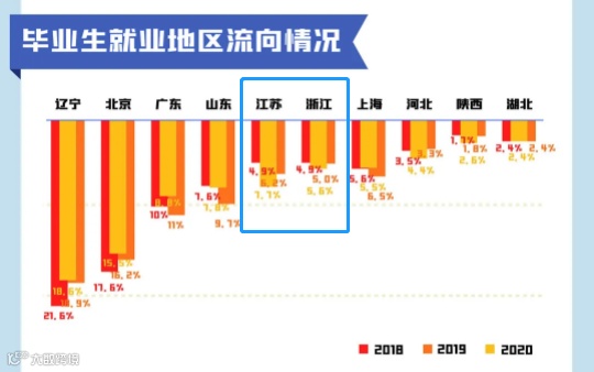 近期正值各校发布就业质量报告,东北大学2020届毕业生就业流向江苏和浙江的比例大增,尤其是江苏。