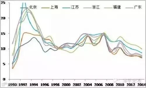 第一类,可以认为已经基本跨越了中等收入陷阱的省市,比如天津、北京、上海、江苏、浙江、广东、福建等7个省市2014年人均超过1万美元,超过或接近高收入国家门槛值,这些省市在90年代初以后经历了对外市场开放和经济高增长,在2008年前后开始增速换挡,经过转型,近年增速相对平稳,高端制造业和现代服务业支撑作用凸显,人口继续流入,类似韩国、中国台湾等高收入俱乐部新贵;