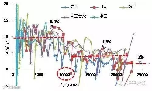 德日台韩在人均GDP11000国际元附近,经济增速平均从8.3%降到4.5%,降幅在50%左右。
