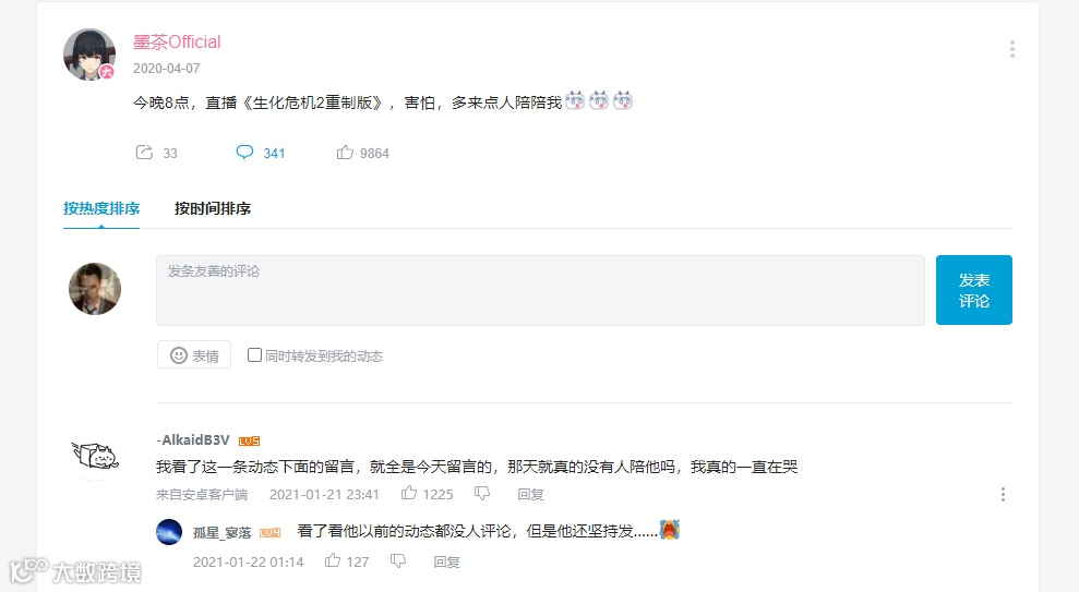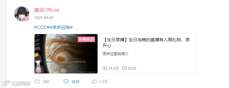 我刚刚翻完了@墨茶official的所有B站动态,一条比一条遗憾。一直翻到最下面,是一个孤岛惊魂的游戏直播,然后看到一行字:
