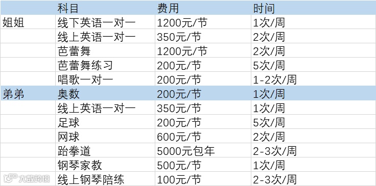 课外班有一个在线英语一对一的外教课,一次大约100元,平均一周三次。去年疫情期间孩子们不能开学,朋友推荐了一个外教,教两个孩子英语,一小时600元,每周大约6小时,3个月花了有1万元,后来我觉得有点贵,开学了之后就停了。