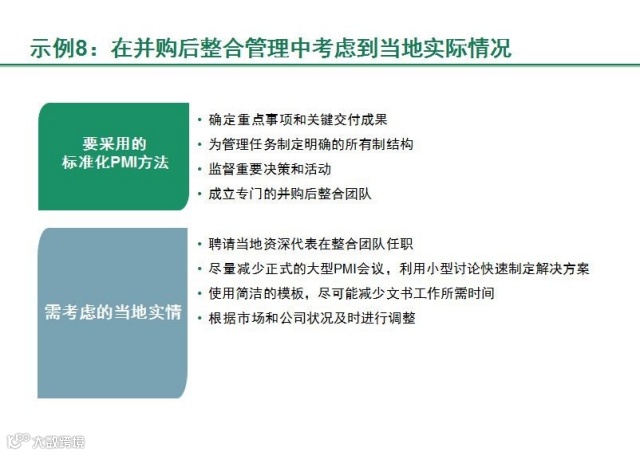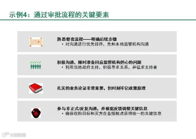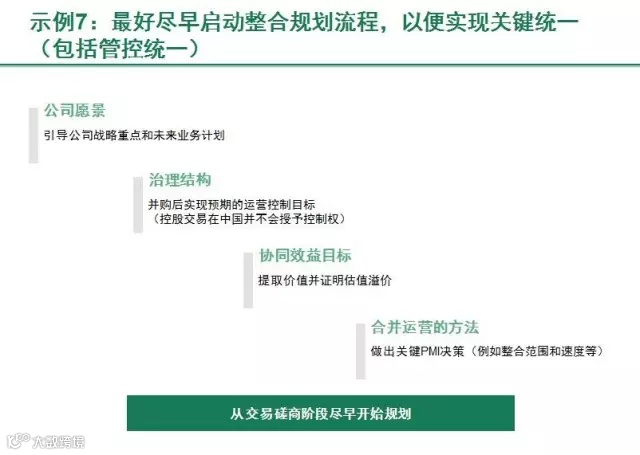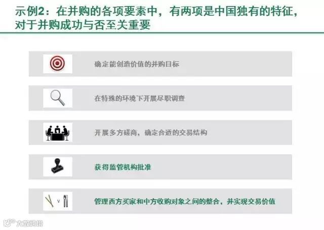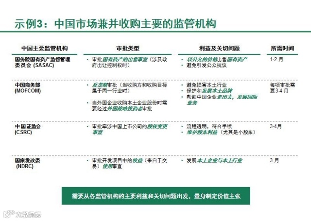 我们过去大量的咨询经验表明,这些障碍都能够被一一克服。在中国,兼并收购案要做成功并不简单:从最初的尽职调查开始,就已面临一系列独特的挑战。其中,有两个步骤尤其让人望而生畏,但他们对兼并收购又非常重要。他们分别是监管审批和并购后整合。尽管有一定难度,但大家也无需视它们为令人费解的暗箱操作:监管审批可以通过系统科学的方法来破译,文化差异可以经由定制化的整合方法来管理。