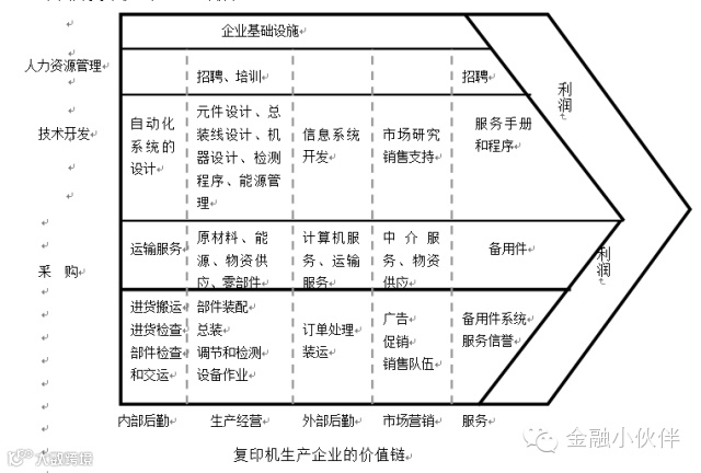 价值链的框架是将链条从基础材料到最终用户分解为独立工序,以理解成本行为和差异来源。通过分析每道工序系统的成本、收入和价值,业务部门可以获得成本差异、累计优势。下图为复印机生产企业的价值链。