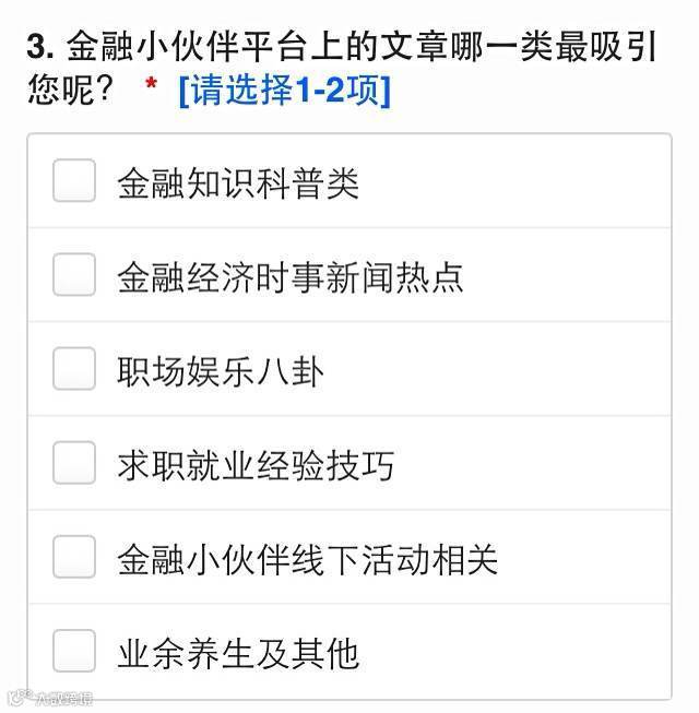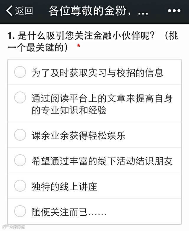 金融小伙伴career从一个草根小号直到现在做出了一定的规模和成绩,金融小伙伴始终感谢广大金粉不渝的支持,为了更好地推送优秀文章,组织更有意义的线下活动,金融小伙伴需要了解每一位金粉的需求与爱好,更好地报答金粉们的关注。还望小伙伴们多多捧场哟~~O(∩_∩)O~~