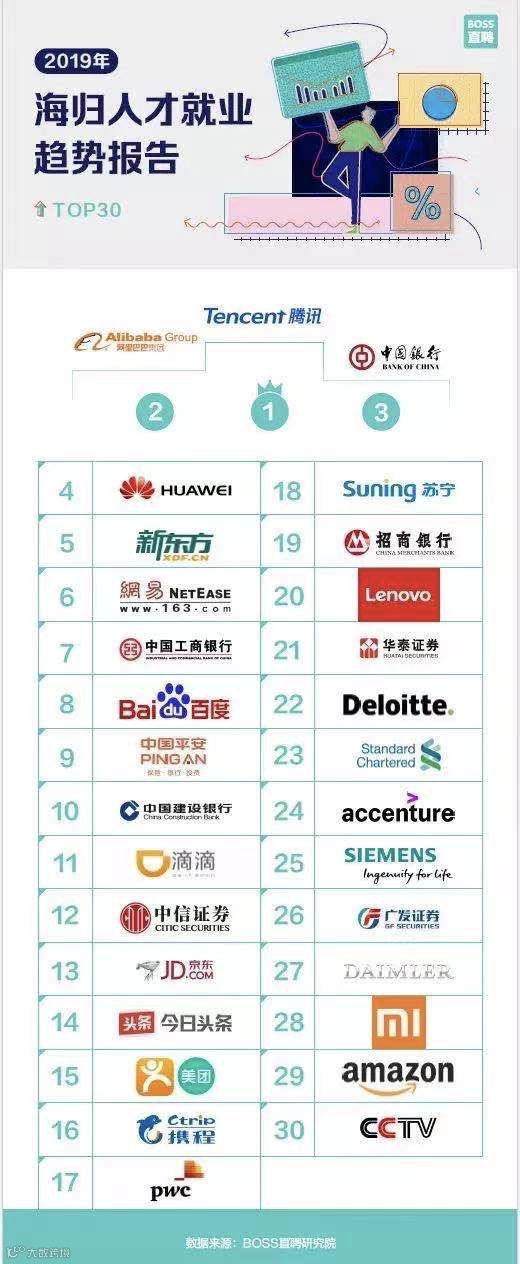 观察榜单我们可以发现:2019 年最受海归青睐的 TOP30 企业中,大部为本土企业,外企占比很少。