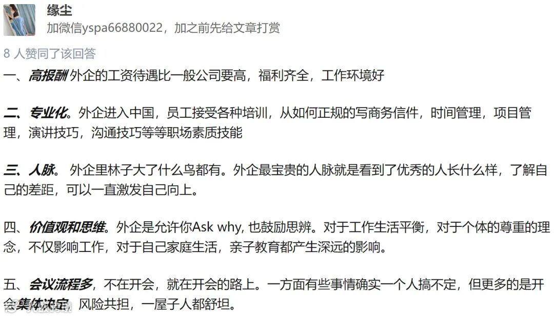 知乎上关于“在外企工作是怎样一种体验”这个问题,同学们讨论的也很热闹: