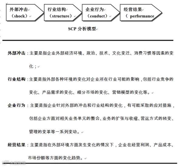 SCP(structure、conduct、performance)模型,分析在行业或者企业收到表面冲击时,可能的战略调整及行为变化。