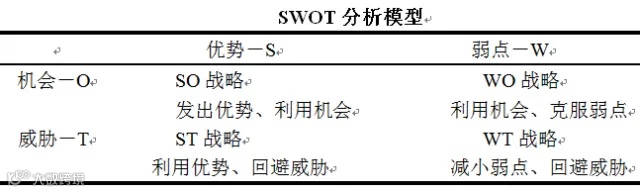 “SWOT”是Strength、Weakness、Opportunity、Threat四个英文单词的缩写,这个模型主要是通过分析企业内部和外部存在的优势和劣势、机会和挑战来概括企业内外部研究结果的一种方法。