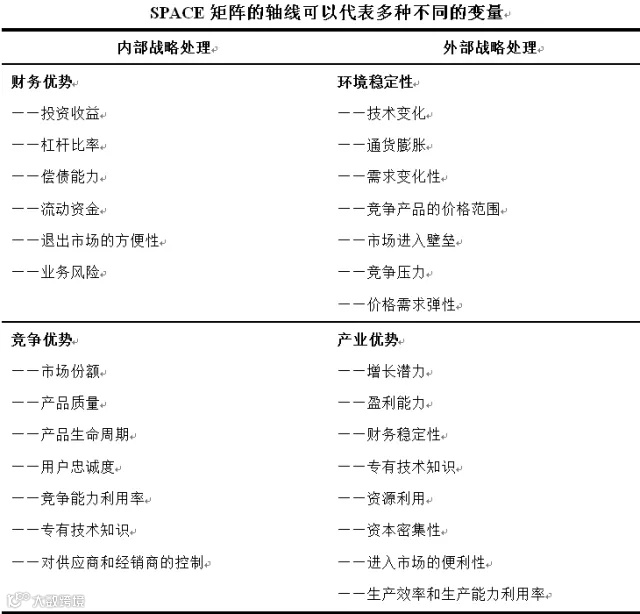 SPACE矩阵要按照被研究企业的情况而制定,并要依据尽可能多的事实信息。根据企业类型的不同,SPACE矩阵的轴线可以代表多种不同的变量。如,投资收益、财务杠杆比率、偿债能力、流动现金、流动资金等。