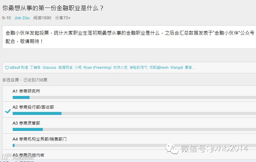 在此由衷感谢各位参与活动发起、积极投票和转发的各位同学和为研究报告提供信息咨询的大神们,这份研究报告都有你们巨大的贡献。而且两天之内收到这么多票数,且所有列出岗位都有不少的人投票,让我们所有的组织人员都为之感叹。另也向一些参与投票的同学表示歉意,有同学认为我们列的岗位缺少其所钟爱的岗位如券商资本市场部,或把券商投行部和固收部门放在一栏表示不满,又或外资类的岗位没有设置等诸多问题。确实调查工作人员在设计选项时有所疏漏,在组织投票过程中也存在着考虑不周的地方,在此真诚地请求各位的见谅。