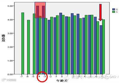 在婚姻家庭中,男性比妻子年龄小3、4岁的被访者,对伴侣的满意度达到峰值;相对地,男性年龄比女伴年龄大7岁时,满意度最低。