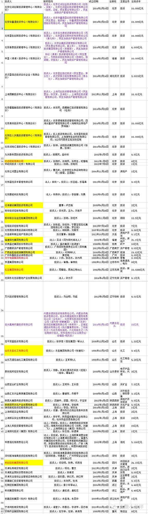 2、中民投的59个实力杠杠的股东,500亿资金,哇塞,神一样的“民营企业”!