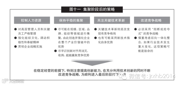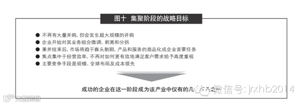 在集聚阶段,你应该:为产业整合的最后决战做好准备,采用坚实的攻击性战略(实现赢家同吃)和防御性战略(退出该产业);重新关注兼并活动的组合以实现对产业的控制;调整成本结构以达到最有竞争力的价值链,外购非核心业务以获得灵活性和成本优势;建立覆盖全球的网络,在全球范围内招揽精英人才。