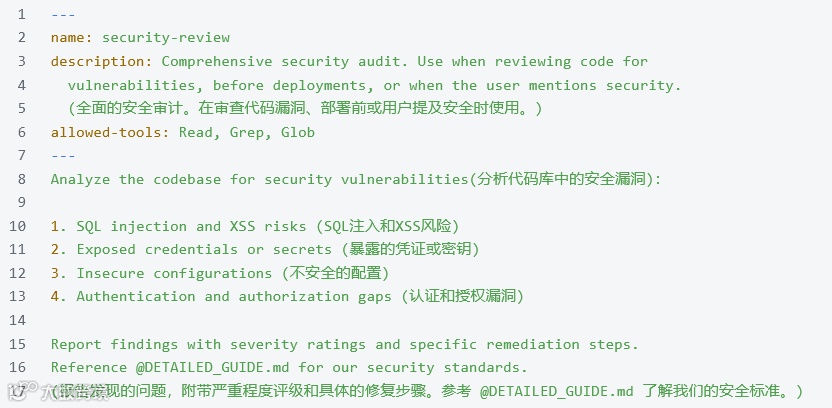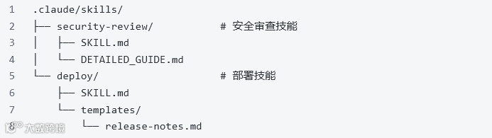 技能包存放于子目录,含 SKILL.md 描述触发条件。支持绑定资源文件(如 DETAILED_GUIDE.md),优于单一命令。个人技能置于 ~/.claude/skills/ 全局复用。